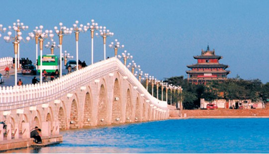 東昌大橋位于聊城古城西首,橫跨東昌湖東西兩岸。2001年6月動(dòng)工修建,2003年落成。古時(shí),人們是由吊橋進(jìn)入古城區(qū),現(xiàn)在連接古城和新城的紐帶就是橫跨在東昌湖上的四座關(guān)橋了。東昌大橋是在原西吊橋的原址部位上修建起來的,它是我市城區(qū)投資最多,規(guī)模最大的橋梁。東昌大橋全長(zhǎng)322米,橋面凈寬15米。上部結(jié)構(gòu)為石砌拱橋,共21孔,象征著跨入21世紀(jì),所以又稱世紀(jì)拱橋。版權(quán)所有山東聊城聊之旅國(guó)際旅行社有限公司,轉(zhuǎn)載必究!中間5孔為懸鏈線拱,兩側(cè)為圓弧拱。主孔通航凈高9米,可供大型游船順利通過。拱圈、橋身采用花崗巖嵌面,橋面青石鋪砌,橋上筑有優(yōu)質(zhì)漢白玉攔板266塊,漢白玉欄桿上雕刻著《水滸》人物故事圖案,漫步東昌大橋一個(gè)來回,就如同看了一遍《水滸傳》。被譽(yù)為“中國(guó)江北最大內(nèi)陸湖泊石拱橋”,堪稱橋梁精品,為美麗的東昌湖增添了一道亮麗的景色。