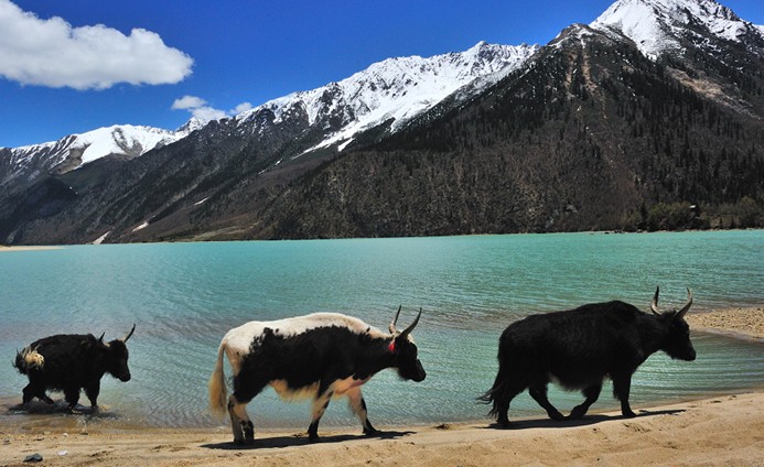 然烏湖周圍高山危聳峻峭,眾多海拔5000米以上的高峰皆有冰川發育;而山下近湖坡地則長滿了青翠蒼勁的松柏等針葉林叢,在這群山綠影環抱之中的然烏湖顯得格外靜謐而嫵媚,它那明鏡般的湖面倒映著四圍的雪峰、翠林和那藍天白云,景色異常迷人;再加上湖畔綠茵般的草灘上成群的牛羊以及一塊塊生長著青稞、豌豆、油菜等作物的農田點綴其間,構成了一幅既有青藏高原獨特的壯麗風貌、又有藏區田園牧歌般風韻的風情畫卷。當你沿著湖邊公路巡視暢游時,你就會充分領略到這里的風采,并讓你有種回歸自然的感覺,心曠神怡之極。