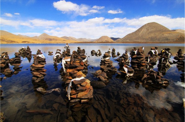 據藏文古籍《五部遺教》等藏文記錄,墨竹思金拉措神湖位于猶如聚寶盤里用金銀財寶向四周供奉曼陀羅。其間,藍天倒映在湖中。而墨竹思金龍王以雪域財主的身份把財寶撒在大地上,撒滿整個雪域山川,并用各種珍貴藥材及樹木、鮮花、野生動物將其點綴,。神湖后面形如龜王的山上有蓮花生大師修行的“仲巴”巖洞及許多歷史悠久的修禪靜地和生成之物。