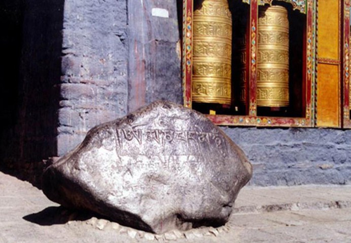 釋迦牟尼傳記畫:位于拉康欽莫大殿內之大經堂東壁。壁畫淋漓盡致地描述了釋迦牟尼佛一生的經歷。壁畫自他為拯救人類痛苦乘象下凡入胎畫起,接著為腋下降生、七步生蓮、比武伏象、王子出行、夜半逾城、六年苦修、降魔成道、傳經弘法、歷經十難、佛祖涅磐、分取舍利等情節。尤以相間繪制的8尊等身像最為引人注目,兩側2尊為立像,右手下垂施與愿印,左手于胸前施無畏印;其余6尊皆結跏趺坐,手分別施與愿印、禪定印、降魔印、說法印等。整幅畫面長達66米,如此鴻篇巨幅的佛傳連環畫實屬罕見。