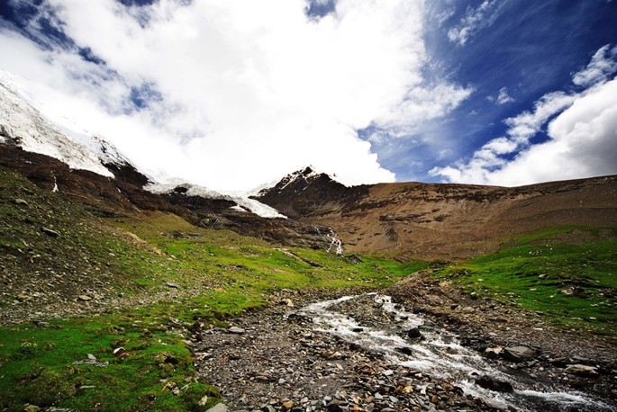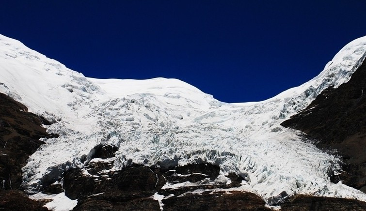 從羊卓雍錯出來后,跨越4330米的斯米拉山口后就來到了卡若拉冰川的冰舌下。冰舌前沿海拔5560米,觀看卡若拉冰川的地方海拔約有5400米,在山口北面5600米左右的地帶,屬寧金抗沙峰冰川向南漂移后形成的懸冰川。