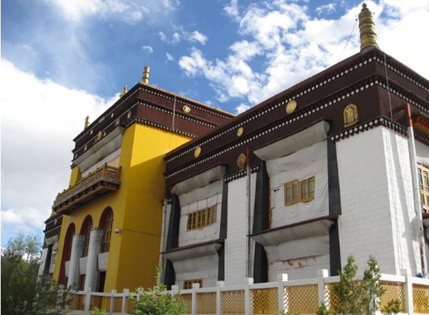 位于扎布倫寺以南,是十世班禪在1954年建造的夏宮,新宮建筑富麗堂皇,十分幽雅,是避暑的好地方。宮內放置了很多西藏歷史文物及藝術精品,尤以一幅《八思巴會見忽必烈》的壁畫,最為精美。