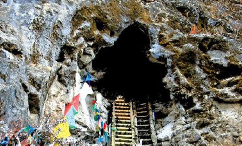 如同一堆鋒利的兵器,整個(gè)形態(tài)象度母靜坐。洞口寬約8米,高近2米,洞深40余米,自上而下有自然形成的蓮花生大師、南木朗•多吉堆窘大譯師等六個(gè)修行洞,及自然形成的形態(tài)逼真的米拉日巴、十六羅漢、大象、蝎子、天龍、地蛇、月亮、太陽(yáng)等80余種畫(huà)面。
