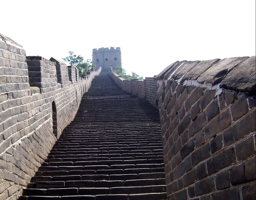 登上第六個敵樓,樓分上下兩層:上層是瞭望臺;下層是成邊將士住房,三面有窗,北邊是射箭孔。整個樓用大方石塊砌成,顯得墩實、堅固,氣度不凡長城的最高處為,需登“天梯”而上。天梯高達100米,坡度85度,幾近垂直,無膽量的絕難征服。仰頭上望,那磚石砌就的臺階僅可容腳,兩側懸崖陡壁,中間這一道臺階細如線,薄如刃,陡如立。