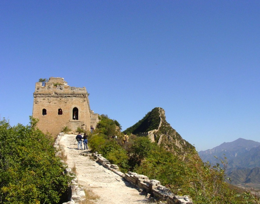 長城的最高處為“仙女樓”,需登“天梯”而上。天梯高達100米,坡度85度,幾近垂直,無膽量的絕難征服。仰頭上望,那磚石砌就的臺階僅可容腳,兩側懸崖陡壁,中間這一道臺階細如線,薄如刃,陡如立,不由人望梯興嘆,倒吸一口涼氣。爬上仙女樓,景色果然更加壯美秀麗,俯首看腳下的懸崖,刀削斧劈一般,幾縷霧嵐掛在絕壁處,更顯得陡峭驚險。西北邊金山嶺長城與司馬臺長城渾然一體,活象一條即將騰飛的蒼龍。長城上大小不同、形態各異的敵樓,恰到好處地建立在各個制高點上,威風凜然,冷峻挺拔。整段長城,完美和諧,氣勢磅礴,處處顯示出她的巧妙、奇特、雄偉和壯麗。再看看連綿不斷的燕山山脈奔涌而起,疊起無數的奇幻;看看遼闊的華北平原無邊無際,一直鋪向目不所及的天邊,在這博大奇異的景色中,令人不由浮想聯翩。