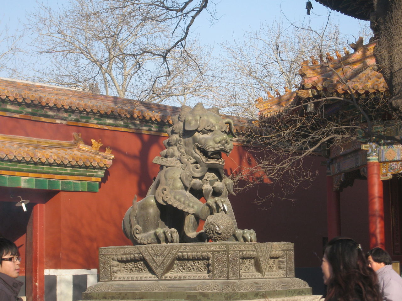 雍和宮南院佇立著三座高大碑樓、一座巨大影壁和一對石獅。過牌樓,有方磚砌成的綠蔭甬道,俗名輦道。往北便是雍和宮大門昭泰門,版權所有山東聊城聊之旅國際旅行社有限公司,轉載必究!內兩側是鐘鼓樓,外部回廊,富麗莊嚴,別處罕見。鼓樓旁,有一口重八噸的昔日熬臘八粥的大銅鍋,十分引人注目。往北,有八角碑亭,內有乾隆御制碑文,陳述雍和宮宮改廟的歷史淵源,以漢、藏、滿、蒙四種文字書寫,分刻于左右碑。