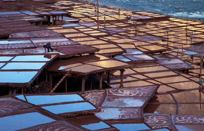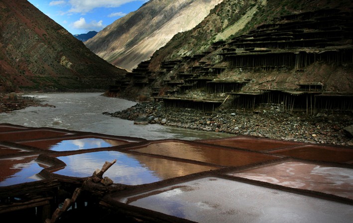 鹽井自古就有產(chǎn)鹽的歷史,而鹽田又成為這里獨(dú)有的一道人造景觀。所謂的鹽田,其實(shí)是在洶涌澎湃的瀾滄江邊搭建的一些土木結(jié)構(gòu)的平臺。順著鹽田之間的小道下坡,鹽水井就挖在江邊。這兒的鹽水井有的深近10米,工人們身背圓柱形的木桶,將鹵水存儲(chǔ)在鹽田邊的槽溝里,其他的工人將鹵水從槽內(nèi)舀出倒入鹽田里。經(jīng)過一天日頭的暴曬和江風(fēng)的吹拂,第二天,鹽田里就會(huì)結(jié)晶出白色的鹽粒了。 依山搭建層層的鹽田氣勢雄偉,鹽民們沿著祖先的足跡,走在崎嶇險(xiǎn)峻的小道上辛勤地勞作,在延續(xù)生命的同時(shí)也創(chuàng)造著世界上獨(dú)特的景觀。