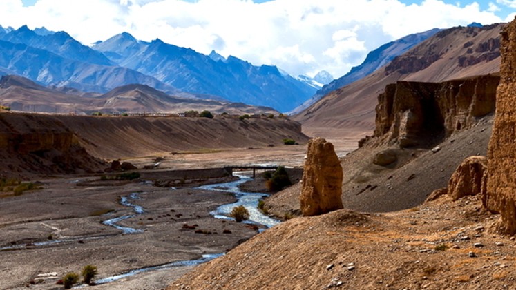 孔雀河谷地帶景色優美,四周雪峰峻峭,雪峰下是風化的礫石和黃沙形成的堆積層,起伏有序,溝壑縱橫。來自孟加拉灣的海洋季風越過喜馬拉雅山吹到這里,形成了青藏高原難得一見的濕潤氣候,大片的綠洲似翡翠般鑲嵌在孔雀河谷,錯落有序的村莊,繚繞的炊煙,趕著牛羊的牧童和轉經的老人,使人仿佛到了一個世外桃源,就像傳說中的香格里拉。