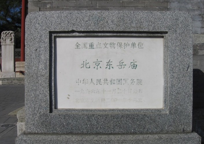 全國重點文物保護單位。位于北京市區東部朝陽區朝陽門外神路街。占地約6萬平方米,是道教正一派在華北地區最大的廟宇。始建于元延?六年 (1319),由玄教大宗師張留孫和其弟子吳全節募資興建。至治三年(1323)完工,賜名東岳仁圣宮,主祀泰山神東岳大帝。清道光年間擴建。廟坐北朝南,由正院、東院、西院三部分組成。正門前有高大雄偉的三洞七幢琉璃牌樓。正院建筑主要有山門、戟門(又稱瞻岱門、龍虎門)、岱宗寶殿(又名仁圣宮)、育德殿、玉皇殿。進戟門始自左右再向北環繞的廡殿為地獄七十六司殿。再向北左有廣嗣殿、太子殿,右有阜財殿、太子殿。岱宗寶殿左右有三茅真君祠堂、吳金節祠堂、張留孫祠堂、山府君祠堂、蒿里丈人祠堂等。最后為后罩樓。東院原為花園,西院為規制不一的小型殿宇,多為民間善會修建。東岳廟雖經重修,但其主體建筑仍保持元代風格,廟內以神像、石碑、楹聯眾多而享譽海內外,趙孟頫書\"張天師神道碑"(俗稱道教碑)即存于廟中。正院已修葺一新,辟為北京民俗博物館,如今,于2008年5月3日,在黨和政府的推動及支持下,北京東岳廟作為道教活動場所正式登記開放。