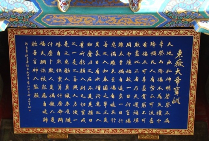 各殿前均掛有楹聯、匾額,集中體現了東岳信仰懲惡揚善的精髓。楹聯多是東岳廟的一大特色景觀。原來,廟內多數殿堂前都掛有白底黑字、小篆字體的楹聯。它們既是對各殿各司神祇職能的詮釋,也是人們對理想生活的憧憬。在“善惡有報”的外衣下,楹聯的內容折映出豐富的中國傳統倫理道德觀念。它們或言簡意賅,發人深省;或深入淺出,雅俗共賞;或意蘊悠長,蘊含哲理,文化內涵相當豐富。