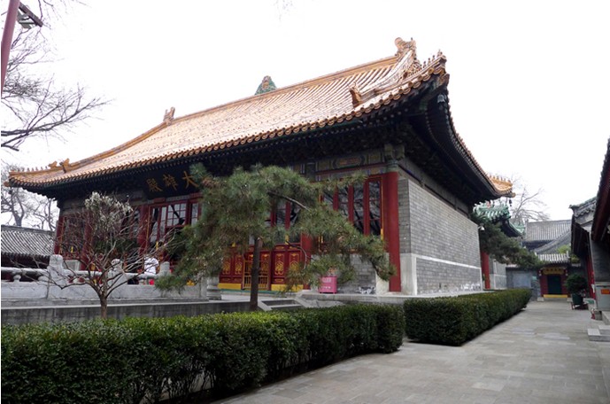 到廣濟(jì)寺朝禮的人們第一眼讓人注目的是天王殿。這里有明代仿唐三彩的四大天王,象征著“風(fēng)調(diào)雨順”。中間為明代銅彌勒像,與各地寺院看到的“大肚能容,容天下難容之事;開口常笑,笑世間可笑之人”的布袋和尚像不同。布袋和尚只是傳說中彌勒佛的化身形象,廣濟(jì)寺天王殿中所供奉的是——天冠彌勒。廣濟(jì)寺最大的殿堂是“大雄殿”。《法華經(jīng)•從地涌出品》:“善哉!善哉!大雄世尊”。大雄是佛陀的德號,即偉大之英雄之意。佛具大智慧,能降伏魔障,故稱大雄。廣濟(jì)寺大雄殿是帝王所敕建,故著黃琉璃瓦。殿脊有香水海,又名華藏世界海,整體呈山形,由水、蓮花和一個梵字構(gòu)成,寓意永恒世界、不生不死。此種殿脊在北京地區(qū)獨此一家。大雄殿所供奉的三世佛,即西側(cè)過去世迦葉佛,中間是現(xiàn)在世釋迦牟尼佛,東側(cè)是未來世的彌勒佛。這樣的組合供奉方式與常見寺院所供奉的西方世界阿彌陀佛、本師釋迦牟尼佛、東方世界藥師佛組合完全不同。佛是智慧之身,法性平等,所表達(dá)的合掌皈依仰慈悲,舉頭見佛生歡喜的精神完全相同。