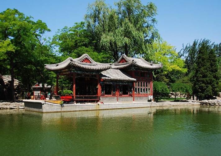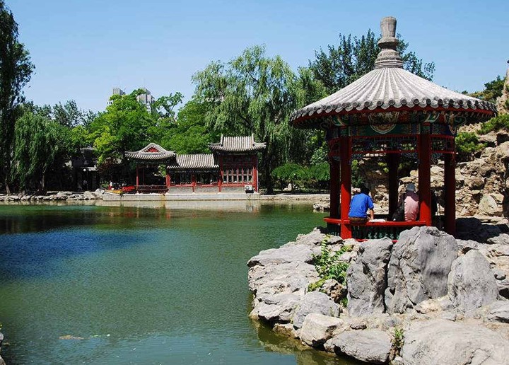 融合了江南庭院的湖光山色和古樸典雅的北方園林風光。景區有近4700平方米的湖面。湖畔倚建古色古香的水榭、畫舫、小園亭,湖南北架以曲橋、拱橋。