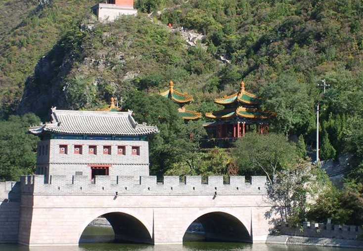 4.軍事防御范圍廣,周圍面積50多公頃,南北券城相距約850米左右,東山頂至西山頂直線距離1150米,防御設施有南、北券城、城樓、水門、水閘、敵樓、鋪房、烽隧、角樓、炮臺等。長城上的敵樓、烽燧、鋪房,是古代打仗時作為掩體和士兵居住的地方,共修復了25座,這些按明代規制燒的城磚,都是靠人工、牲畜往上運送材料。高大雄偉的城樓,南北各有一座,樓為三重檐歇山式綠琉璃瓦翦邊,高21米,下面城臺高10米。城樓是指揮作戰的中心,所以建造高大。站在樓上,可以一目了然,有利于觀敵情。城臺下面有券門通甕城。甕城即大城門外的月城,用以增強城池的防御力量。