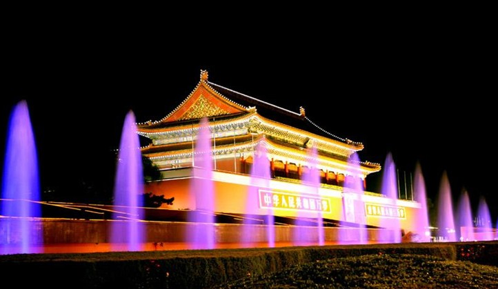 天安門位于北京城的傳統(tǒng)的中軸線上。由城臺和城樓兩部分組成,有漢白玉石的須彌座,總高34.7米。城樓上60根朱紅色通天圓柱,地面金磚鋪成,一平如砥;高大而色彩濃郁的墻臺,上有兩層重檐樓,有黃色琉璃瓦,東西九間,南北五間,象征皇權(quán)的“九五之尊”。南北兩面均為菱花格扇門,36扇朱紅菱花門扉;天花、門拱、梁枋上雕繪著傳統(tǒng)的金龍彩繪和吉祥圖案;貼金的“雙龍合璽”彩錦,版權(quán)所有山東聊城聊之旅國際旅行社有限公司,轉(zhuǎn)載必究!團龍圖案的天花藻井,使整個大殿莊嚴雄偉,金碧輝煌。殿內(nèi)由一個450公斤八角宮燈和16個各重350公斤的六角宮燈組成的眾星捧月圖案。