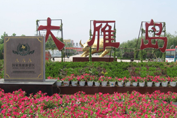 一座占地200余畝的江南園林式建筑——大雁島綠色生態園,集住宿、娛樂、餐飲、旅游為一體,不但有動物園、果園等游玩之地,更有德州最大的溫泉游泳大廳。還有美麗的大雁湖、清幽的 音樂臺等賞玩去處,占地15畝的酒店大廳,數百種海南及國外植物郁郁蔥蔥,假山瀑布、小橋流水、亭廊樓閣應有盡有。2005年,投資6000余萬元的溫泉城建成,并于當年11月19日投入使用,其規模居山東乃至周邊省市之首,封閉建筑面積2萬余平方米,城內環境幽雅別致,池周有形態各異的南方園林樹木,廳中有城,城上有數不盡的奇花異草,池邊有亭、古羅馬式圓亭古樸莊重,赤色巨石層巒疊翠,青色圍墻千姿百態,漢白玉小橋如月似虹,沖浪池巨龍活靈活現。池中有池,園中有園,洞中有池,池中現島。彎彎曲曲的半圓形滑道把樓池連為一體。由淺入深的巨大沖浪池,占據大廳中央,波濤洶涌,浪花飛濺,水能習性強的人在深水處或被托向浪尖,或被踮入浪谷,歡聲笑聲一片;頑皮的兒童坐在池邊不斷用雙手迎著浪花,與水相戲;溫泉池里,一排排按摩床在岸邊或隱或現,股股泉水噴涌,躺在上邊,比器械按摩更舒心,更愜意。右邊,斜面噴泉似箭,形成一片白色,身體靠過去,萬點熱水滴直擊身體,一身的疲勞頃刻間化為烏有。