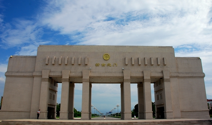 新世紀門坐落在中心廣場南側,寬度為40米,高度為16米。新世紀門既可作為市委、市政府綜合辦公樓的屏風,又可作為廣場南面勝利路的底景,中心廣場鋪裝及綠化占地3.2萬平方米,其中綠地1.28萬平方米。綠地以冬綠型草為主,間接布置龍柏、月季、雪松、法桐等樹種,形成四季有花、四季青綠的效果。綠地內設自動噴灌系統。