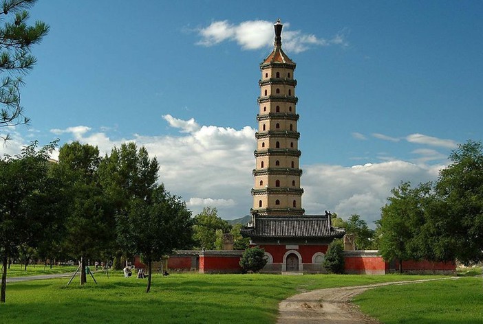 普寧寺位于承德市避暑山莊之北,因寺內有木雕大佛,又稱大佛寺,建于清乾隆二十年至二十三年(1755~1758年)。此寺仿西藏三摩耶廟形式而建。按佛教教義關于世界構造的模型布局,中央的大乘閣象徵須彌山,四周的殿宇象徵四大部洲。安遠廟是仿新疆伊犁固爾扎廟修建。普陀宗乘之廟和須彌福壽之廟,前者信拉薩布達拉宮后者仿扎什倫布寺修建。這些建筑藝術形象既反映了民族團結,又起到了民族間建筑文化交流的作用。山莊周圍寺廟,環山莊半圓建成,呈眾星捧月之勢,政治寓義十分明確。從收效看也確實是“一座喇嘛廟,勝抵十萬兵”。全寺占地約2.3萬平方米,主要建筑有鐘鼓樓、碑亭、天王殿、大雄寶殿、大乘閣等。大乘閣高36.75米,外觀六層重檐。閣內置木雕千手千眼觀音貼金立像,高22.23米。用松柏榆杉椴五種木材雕成,是國內現存的最大木雕佛像之一,已經被錄入《吉尼斯大全》。佛像兩側有善財、龍女侍立,造型圓潤。閣兩側有妙嚴室和講經堂,分別是清帝聽經和休憩之所。