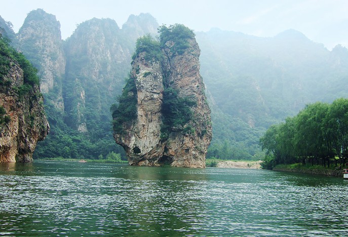 是由英納河緩聚而成的湖,由于冰峪的東南面近海,海水形成的霧氣經常大團的涌進谷口,使這里云霧籠罩,而英納河從西北流來,在這里形成了一個美麗的大湖,云水渡是取云水共渡之意。云水渡是冰峪溝風景區的精華所在,兩岸峭壁秀絕,奇峰怪石林立。其中有一根石柱,高40米,稱之為“中流砥柱”,它周圍的水域叫“龍門潭“,因潭中鯉魚很多,取“鯉魚跳龍門”之意。