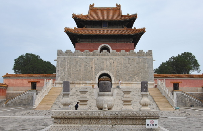 昌陵的建筑形式與布局,跟泰陵基本一致,其豪華富麗亦不亞于泰陵。隆恩殿大柱包金飾云龍,金碧輝煌,地面用貴重的花斑石墁地,黃色的方石板上,帶有紫色花紋,光滑耀眼,好像滿堂寶石,別具特色。昌陵有清朝建立的最后一座圣德神功碑亭,此后清朝皇帝各陵均不建圣德神功碑亭。