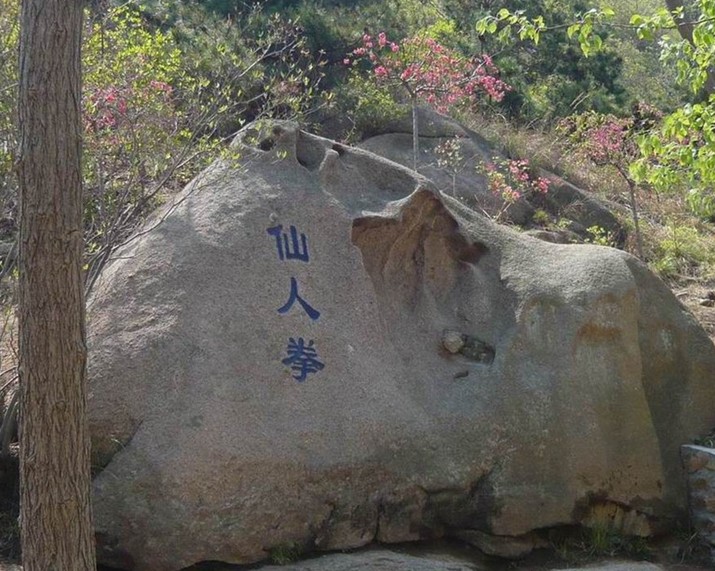 從石門澗逆溪水往山上走,過鰲魚石、剪子峰,來到麻衣山前,這里有麻衣庵的殘垣。據民國年間的《增修膠志》記載,晉代的陳仲舉、元代的張清源、明代的趙麻衣等名士曾在這里隱居過。庵后的峭壁上,有一懸空石室,室門鑿造得很精致,門高兩米,頂為孤形,有石門框和石雕門檻。在離石室前約3米處有刻有蓮花圖的蓮花石?!对鲂弈z志》記載,在石室與蓮花石之間古有鐵板橋連接,人可攀蓮花石過鐵板橋進石室。石室東側的山壁上刻有“云逍庵”三字。石壁上還有李慶道等人署名的“玉泉觀旨緣”石刻,又有元代大德四年(1301年)孫榮題寫的“太清巖”刻字。庵東側有 “飛來石”,石前額刻“朝陽洞”三字。庵前有“說法石”,在說法石下,有一石碾底,透出過去這里的人間煙火氣息。庵西側的高處有一平臺,條石砌的建筑基礎很規整,站在這里可以東望靈山灣,西望龍灣,這是“望海樓”的故址。