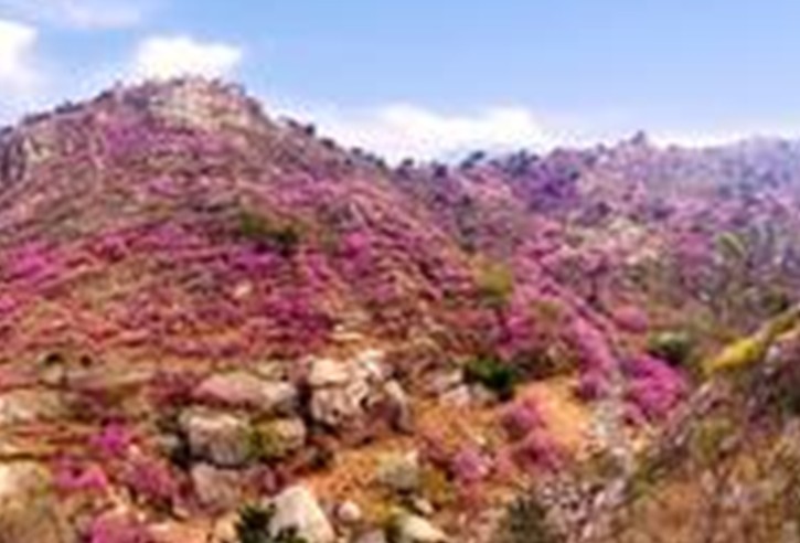 在大珠山東麓,有一條山谷,人稱珠山秀谷。這條山谷有5里之長,谷內溪水奔流,匯入山下的人工湖。碧水和青山相依相擁,青峰倒映在碧水中。游人繞湖邊行,緣溪水入山谷,猶如走進畫境。珠山秀谷里春天來得早。清明節還不到,山谷入口處的櫻桃花、杏花、桃花相繼盛開。清明節一過,在山谷里的溪水畔和山坡上,嬌黃的連翹花團團簇簇,潔白的棠梨花一片連一片。春風吹拂,花枝搖曳,山谷里金波涌動,雪浪起伏。再往山谷深處走,有一道花的山峰縱向而立,又把這條山谷分成兩條山谷。順北面的山谷繼續前行,只見南面背陰山坡上,紅色的杜鵑花從谷底一直開到山頂,就連山崖上和峭壁上,也花叢茂盛,花影綽約。站在山下往山頂望去,“花浪”排空,直接藍天,叫人覺這花兒是天界飄下的芳菲;站在山坡高處向下望,“花潮”滾滾,滿山谷里騰著花煙花霧,叫人想到這花兒是大地深處生發出的瑞氣紫光。沿著花間的石階路走,你的周圍到處是花的洪流,花的瀑布,人被裹進了花的漩渦中。進入4月,珠山秀谷里花如海,人也充谷盈川,花事和游人匯成了旅游潮。登上山頂,可見南面有好幾條山谷里也盛開著杜鵑花,遠遠望去,如云似霞。