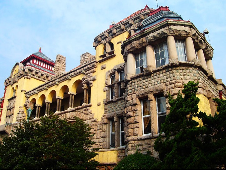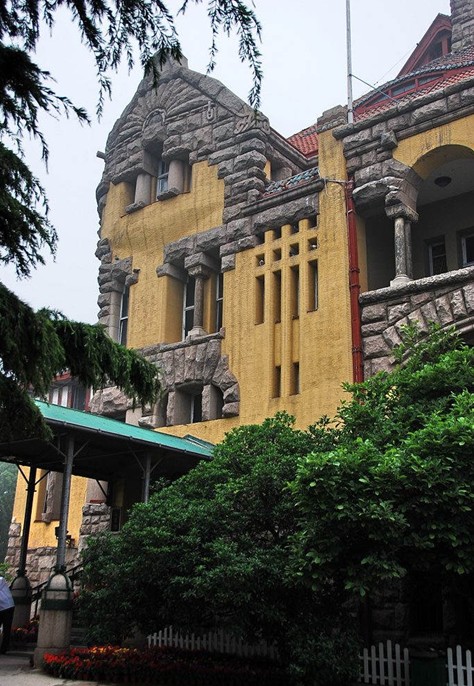 青島總督府,氣勢宏偉,建筑面積為4083平方米,高度為30米,厚達(dá)60多厘米的外墻以黃色為基調(diào),局部以花崗巖石料作裝飾,石面加工粗樸,正門墻飾以淡綠色、淡灰色花崗巖石,頂部石料雕以美麗的圖案,于粗放之中見精巧。米紅色筒瓦、藍(lán)色魚鱗瓦、綠色牛舌瓦鋪設(shè)的樓頂,使大樓更加精美別致。1957年環(huán)繞迎賓館修建了圍墻形成了占地面積達(dá)86000多平方米的庭院,院內(nèi)遍植果樹和多種觀賞植物。