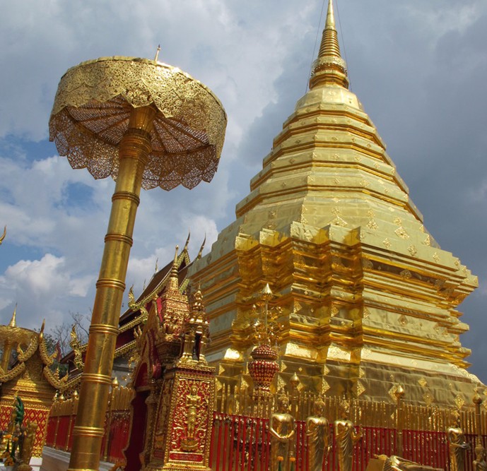 并立而著名的寺廟。據說,游覽該寺的人,如能數得出有20座佛塔,必獲吉兆。自南邦府再南走不遠有泰國的棉織中心村。這里盛產泰國棉花,村內有約2000架手工紡紗機,是著名的棉織品產地。藏有佛祖舍利子的雙龍寺。雙龍寺位于素貼山山頂,建於1383年,又稱‘舍利子佛寺’。稱為雙龍寺是因為寺門外石階兩側各雕有一條長達500米的巨龍,十分壯觀。稱為舍利于佛寺是因為寺內有一座建于16世紀的金塔,據說塔內藏有佛祖釋迦牟尼的舍利子,故被視為圣地。清邁王朝歷代帝王對此寺都十分崇敬,常來此朝拜。而來此朝拜的各地信徒更是絡繹不絕,每年6一7月均在此舉行禮佛盛會。登上素貼山頂可遠眺清邁市全景。