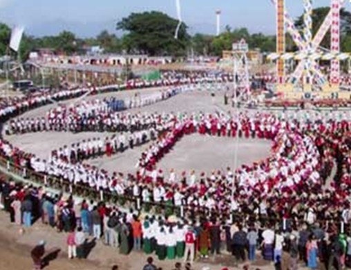 1958年,在密支那修建了永久性的目瑙祭壇,嗣后每年都在這里舉行全邦性的目瑙會。目瑙埸建在江邊,埸地寬闊,設有西門和北門。兩門頗有民族特色,是一個模子倒出來的。門枋是一對象牙抬著一扇铓,兩側是四根交叉的雌雄目瑙柱,門衛是兩位手持長刀和梭鏢的克欽先民武士。目瑙祭壇與德宏的大同小異,德宏的是四根直立的雌雄柱,中間是兩把雌雄刀;密支那的是十根交叉的雌雄柱,中間有一根橫桿固定其交叉部位。其共同點是基座均為犀鳥,雌柱上繪的蕨葉藤和雄柱上的三角圖案相似,中間兩根雌雄柱頂端各繪著月亮和太陽,南側建有祭鬼崗樓。目瑙柱北邊矗立著一座龐大的目瑙房,這是一所典型的克欽族現代建筑,不僅氣派豪華,而且極富民族特色。尤其是陽臺上的7根粗實巨大的中柱,繪滿了豐富多彩的民族圖案,它象征著克欽族由7個支系組成,在牛頭文化精神的引領下,克欽族將獲得新生。