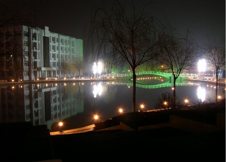 燕鳴湖——身份與精神的延展。燕大之美,在夫燕園一景,燕園之美,存諸燕鳴一湖。“燕”是歡樂的意思,宴會的“宴”在古代和這個字是通用的。它們似乎讓學校更多了些靈性。湖水倒映著一座“摩天大廈”,光亮的樓身在海風中散發出雄偉的魅力。一座石橋貫通湖面東西,橋下水壩把燕鳴湖分成南北兩個湖區,把校園點綴得相當漂亮。每當第一縷陽光灑向湖面,就看到眾多學子在湖邊晨讀;每當夜晚降臨,燕鳴湖更是成了同學們小聚的天堂,空氣中洋溢著溫馨的氣息。