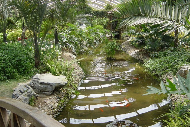 位于公園中部,溪流到此處寬狹不等,曲折多變。河兩岸群植竹、杉及灌木,河邊楊柳飄絲,南岸樹叢中隱現一只面積18.5平方米的竹亭。北岸有座呈直角形的綠蔭茶室,墻體為毛石砌就,外形樸素、粗獷,部分建筑伸出水面,有竹甬道與岸相聯,建筑面積350.25平方米。室內設裝飾壁爐,墻上懸掛獸頭鹿角,野趣盎然。景區南有座三孔石拱橋,長13米,寬3.1米;橋上的花崗石亭面積10平方米。過橋向西有組蘑菇亭,混合結構,面積共30.6平方米,亭下配有石桌石凳。