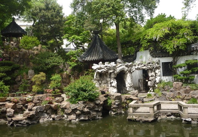 積玉水廊倚豫園東圍墻,臨曲池,積玉峰立于廊間。積玉峰玲瓏剔透,原在也是園內(nèi),1956年移到豫園。池西及玉華堂前后,流水瀠洄,山石嵯峨,花木扶疏,植白玉蘭、白皮松、翠竹,幽雅恬靜。