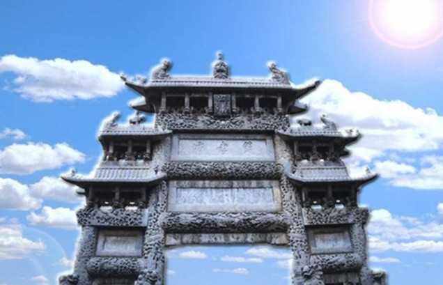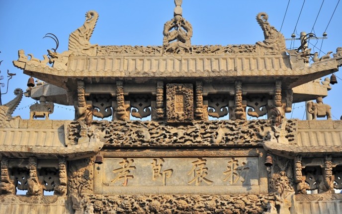 因雕有一百個不同書體的壽字而得名。坊以青色魚子狀石灰?guī)r構成,通高l3米、寬8米,四柱三間三層樓閣式建筑。其獨特之處是:坊座雕有8頭矯健雄獅昂首遠望,8條出水蚊龍繞柱回舞,額枋上飾滿盛開牡丹,與正間上下額枋祥云間翩翩飛舞的5只透雕仙鶴、次間上額枋浮雕的相對翱翔之鸞鳳構成了具有無窮魅力之藝術佳作,寓意福壽萬年、富貴無媲或喜上眉梢。
