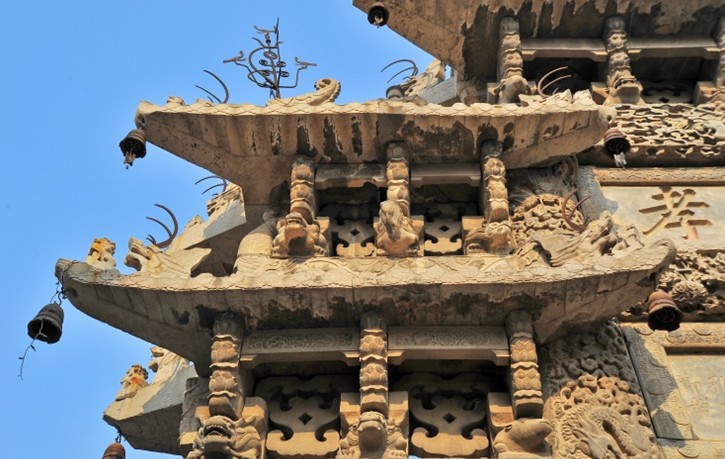 百壽坊俗稱朱家牌坊,位于單縣城內(nèi)勝利北街,乃清乾隆三十年(1765年)為翰林院孔目贈儒林郎朱叔琪妻孔氏而建,因雕有一百個不同書體的壽字而得名。坊以青色魚子狀石灰?guī)r構成,通高l3米、寬8米,四柱三間三層樓閣式建筑。其獨特之處是:坊座雕有8頭矯健雄獅昂首遠望,8條出水蚊龍繞柱回舞,額枋上飾滿盛開牡丹,與正間上下額枋祥云間翩翩飛舞的5只透雕仙鶴、次間上額枋浮雕的相對翱翔之鸞鳳構成了具有無窮魅力之藝術佳作,寓意福壽萬年、富貴無媲或喜上眉梢。