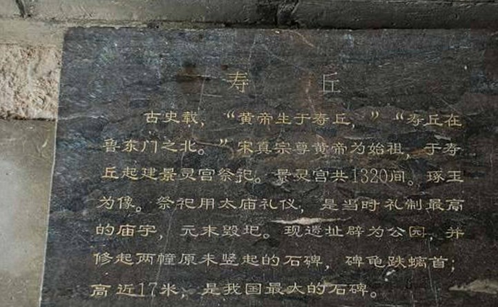 《曲阜縣志•古跡》載:宋大中祥符五年閏十月,宋真宗以始祖黃帝生于壽丘之故,下詔改曲阜縣名為仙源縣,并徙治所于壽丘。詔建景靈宮于壽丘,以奉祀黃帝。根據(jù)《曲阜縣志》引元代至正十年周伯琦《重修景靈宮記》石碑記載:帝建宮祠軒轅曰圣祖,又建太極殿祠其配(應(yīng)為母)曰圣母。越四年而宮成,總千三百二十楹,其崇宏壯麗無比,……琢玉石為像龕于中殿,以表尊嚴(yán),歲時朝獻(xiàn)如太廟儀,命學(xué)老氏者侍祠,而以大臣領(lǐng)之。大碑四通,諺云:‘萬人愁’者是也,其中二碑廣二十三尺,闊半之,厚四尺;赑屃高十有三尺,闊半之,厚四尺,龜趺十有八尺。另二碑廣二十有四尺,闊半之,厚四尺,赑屃高十有八尺,闊十有六尺,厚四尺,龜趺十有九尺,無文字,意者未成而金兵至也。陵曰壽陵(即壽丘)。