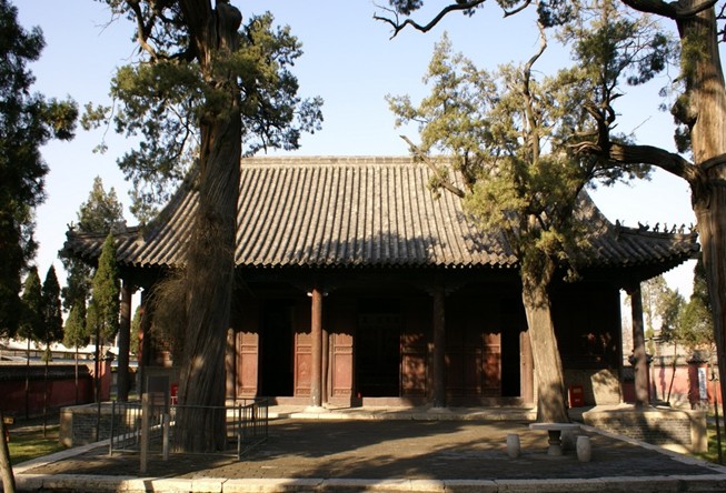 在孟廟寢殿前露臺(tái)和甬道之上,有3株古檜。據(jù)《三遷志》記載,為北宋宣和年間所植,距今已有近900年的歷史,是孟廟內(nèi)最為古老的樹(shù)木之一,現(xiàn)依然青翠蓊郁,茁壯茂盛。奇妙的是其中一株古檜,不僅樹(shù)頂干枝造型為“鹿回頭”(林默涵語(yǔ)),頗為奇特,而且在樹(shù)干之上的鳥洞中寄生出數(shù)株枸杞,枝繁葉茂。夏秋之際,碧綠的枸杞葉簇?fù)碇t紅的果實(shí),迎風(fēng)搖曳,妙趣橫生,煞是喜人。