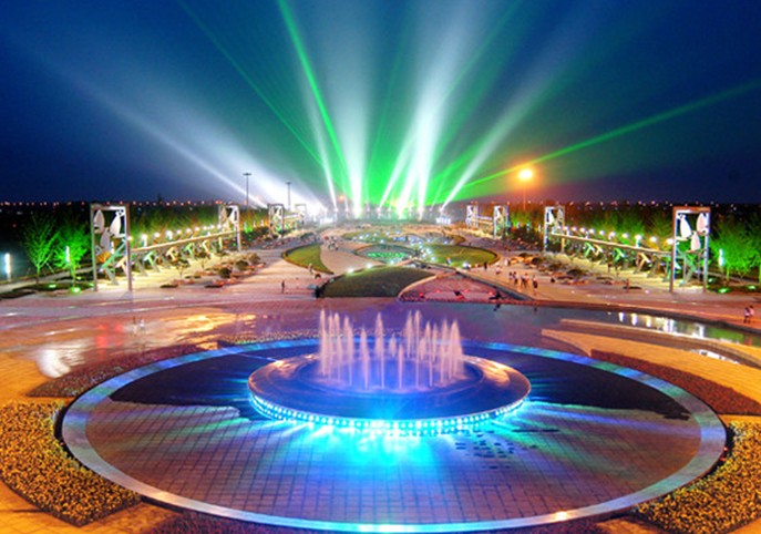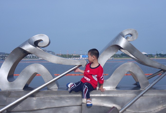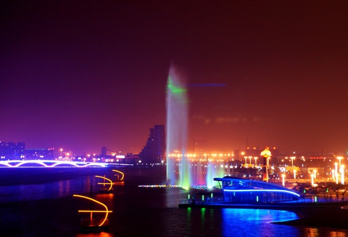 太陽廣場,占地9萬平米,最多可容納觀眾3萬人,中國水上運動會開幕式在這里舉行。廣場以“水”為創作元素,西部入口處是一個圓形噴泉;中間是一條蜿蜒曲折的溪流水景帶,溪流上建有幾座設計別致的小型景觀拱橋,溪流帶中間安放6組水上運動造型的鑄銅雕塑;廣場兩側各有兩組燈光廊架,白天是造型別致的雕塑,夜晚是絢麗多姿的燈光景觀。太陽廣場東側環抱水域中的是水中舞臺,有百米地下通道與舞臺水中地下室相通;舞臺東側是大型音樂噴泉,這是目前我省最大的音樂噴泉,也是國內為數不多的大型海水音樂噴泉之一,它有十多種水型變化,噴泉長112米,最大寬度為70米,主噴噴射高度達80米,是全國為數不多的海水噴泉之一。噴泉下面設有浮排和浮箱裝置,可以根據需要自由升降,配合燈光變幻,造型萬千,美不勝收。南端是一組彰顯海洋文化和水上運動特色的文化景墻,幾十座景觀照明燈在廣場中間赫然而立,盡顯雍容華貴。左側臨水處是幾組伸向瀉湖水中的瀕水大臺階,整齊流暢、恢宏大氣。