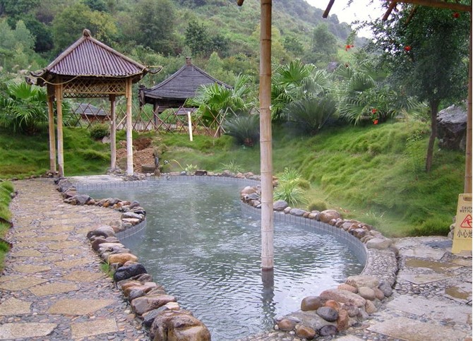 大明谷溫泉村坐落于閩清縣桔林鄉湯兜村,有著寬闊的水面與閩江相連,湖光山色、碧波蕩漾,可謂風光旖旎。溫泉村內的溫泉屬于硫化氫泉,水質好,日出水量大,酸堿值為7.15,溫度最高為65℃。