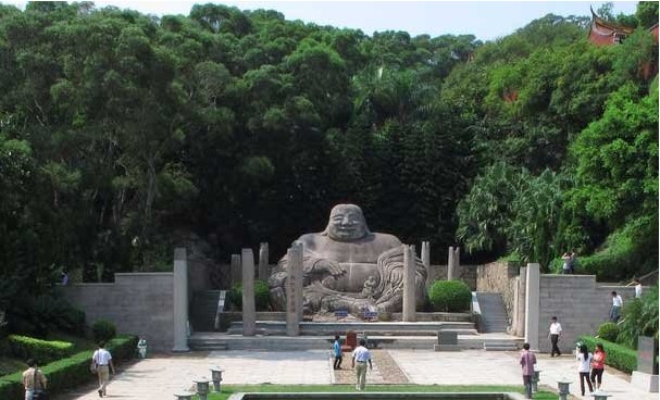 彌勒巖山麓,有一高大石佛盤膝而坐,這就是名聞遐邇的彌勒石雕造像。石佛像始鑿于元至正年(公元1341年),至明洪武年(公元1368年)竣工,高6.8米,寬8.9米,由整塊花崗巖就地琢成,天然妙相,袒胸露腹,兩耳垂肩,笑態可掬,觀者可以忘憂。經國家文物局認定,該石佛為全國最大的立體石刻彌勒佛像,已納入國家級文物保護單位。