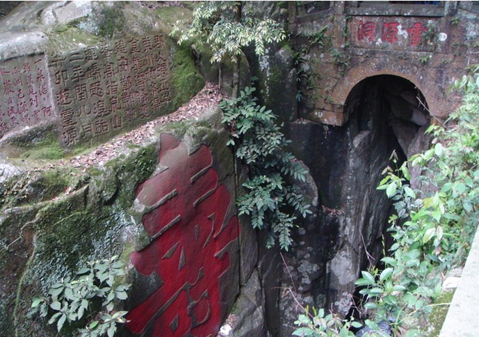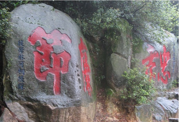 北宋大書法家蔡襄等題名“邵去華,蘇才翁,郭世濟,蔡君謨,慶歷丙戌(1046年)孟秋八日游靈源洞”,為全山最早的石刻。“喝水巖”為宋嘉祐六年(1061年)施元長所題;二段“國師巖”題刻分別為宋蔡襄和慶歷進士陳襄所題。刻在靈源洞蹴鰲橋下深澗巖壁上的“壽”字,楷書,字高4.15米,寬3.05米,是福建省最大的古代摩崖石刻之一。在橋下西南側巖壁刻有“頑石點頭”佛像,像高2.45米,手捧經(jīng)卷,趺坐蒲團。在觀音閣東側石門巖上,刻有郭沫若于1962年11月游鼓山涌泉寺詩:“節(jié)屆重陽日,我來訪涌泉。清風鳴地籟,凝雨濕山川。浮嶺多松柏,依崖有杜鵑。考亭遺址在,人跡卻蕭然。”
