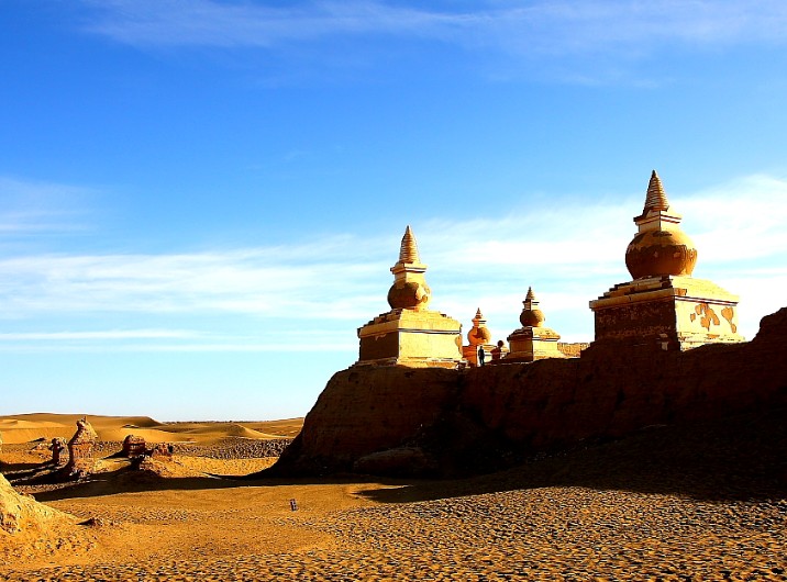 在黑水城眾多的建筑中,宗教建筑是這座古城的一大特色。黑水城,曾是一個多民族聚居的城市。歷史上曾建造過許多宗教寺院。有佛教、道教和伊斯蘭教等不同的建筑。其中以佛教建筑最多,而且占地面積也最大。版權所有山東聊城聊之旅國際旅行社有限公司,轉載必究!在西北角的城墻上,至今還聳立著5座寶瓶似的佛塔。最高的一座達13米。佛塔是用土坯壘成,雖經數百年的風沙侵襲,今天依然聳立云端,成為黑水城獨具魅力的標志。