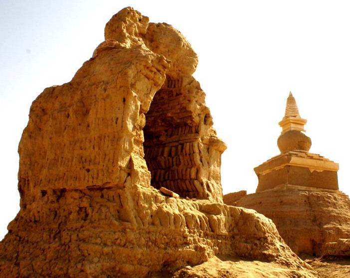 1350年前后,這里的情況發生了巨大的變化。昔日的綠洲,被沙漠吞噬,變成了一片荒漠。昔日繁華昌盛的黑水城也變成了一座廢城。現在它們的痕跡依稀可辨。磚石,瓦塊,陶瓷殘片,鐵器,雕刻,泥佛,風化的白骨,破裂的石磨,塊壘等當年的遺物。在古城遺址的西北角上,端坐著12米高的西藏覆缽式佛塔,古樸,圓融,安詳,是黑城的標志性建筑。城內,荒涼滿目,流沙下遍布官邸、寺廟和民居的頹垣斷壁,到處都散落著各種瓷器和碎片。黑釉刻花、白釉褐彩,以及鈞瓷和南方的龍泉瓷等等。城外還有幾座殘缺不全的喇嘛塔,像是守城的衛士肅然而立。
