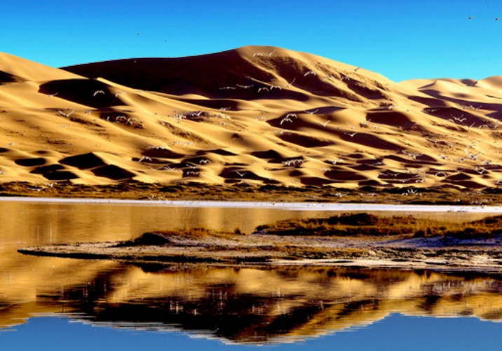 騰格里沙漠天鵝湖已成為阿拉善盟開展沙漠探險和生態(tài)觀光的最佳旅游地。