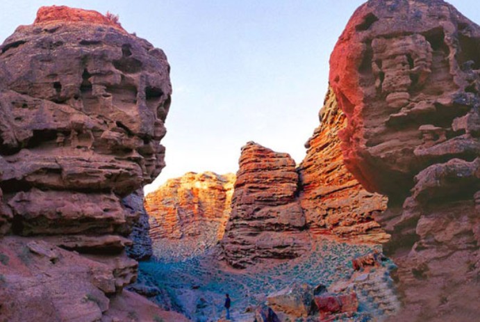 進入峽谷漸行漸遠,眼前景致的獨特讓人感到無比驚訝,只有發(fā)自內(nèi)心地贊嘆大自然的鬼斧神工,不由地想起兩句古詩:遠看成嶺側(cè)成峰,遠近高低各不同。同一座山峰,從不同角度看、從不同的人眼中看,風(fēng)景都不一樣,甚至有藝術(shù)靈感的人可以運用抽象思維,讓面前的山峰變幻成更多畫面,而自己的思想就像野馬馳騁在寬闊的原野上,在抽象世界冥想,沉浸其中無法自拔。