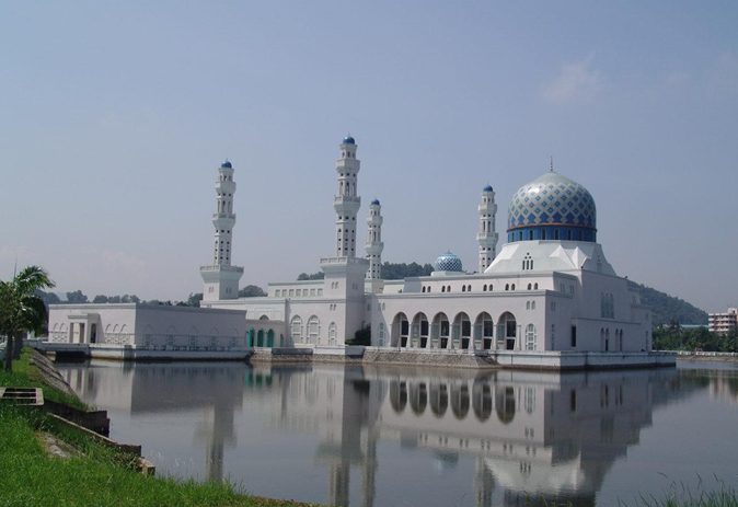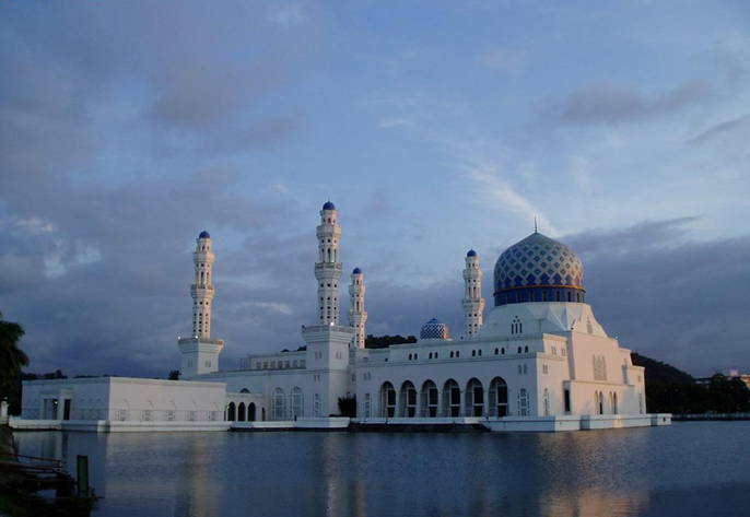 哥達(dá)京那巴魯市立清真寺座落在里卡士灣畔(Likas Bay),是一座典型的當(dāng)代伊斯蘭教建筑,是馬來(lái)西亞夕陽(yáng)景觀最壯麗的清真寺之一。它建于里卡士灣的人造湖上,感覺(jué)有如浮在水面之上,因而得到“水上清真寺”的美稱。令人驚嘆的白色建筑物造型,與藍(lán)天完美的連成一體。清真寺于1997年建成,占地一公頃,可容納最多12,000名教徒祈禱。