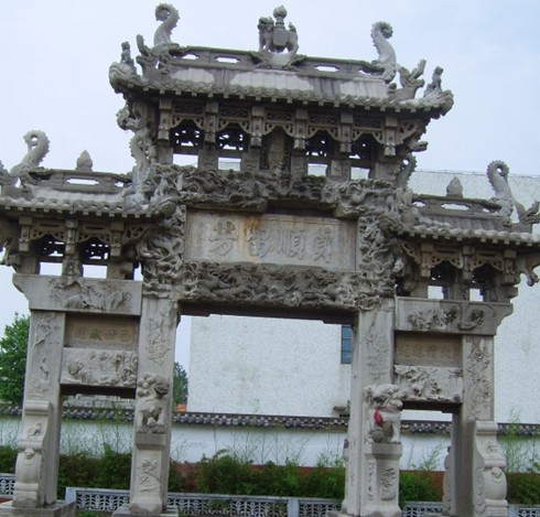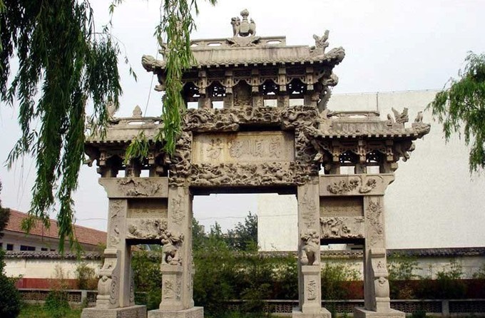 石坊坐西朝東,通高約12米,寬9.35米,全用石灰石壘疊而成。其結(jié)構(gòu)可分為座、身、頂三部分。坊座為4塊條狀基石及4組圓雕石獅,坊身是由4根立柱組成的正門和兩個邊門,坊頂為單檐廡殿式。上部兩面均刻“圣旨”二字,兩面正樓匾分別鐫刻“節(jié)動天褒”、“貞順留芳”楷書大字,題跋為“旌表儒童馬若愚妻王氏節(jié)孝坊”,次樓匾上的刻字分別是“大清道光”、“已丑歲建”。 版權(quán)所有山東聊城聊之旅國際旅行社有限公司,轉(zhuǎn)載必究!坊上題字傳為高密翰林單蘭亭所書。石坊的雕刻內(nèi)容豐富多彩,既有神話傳說中的仙人異獸,又有現(xiàn)實中的風(fēng)土人情。藝人采用淺浮雕、高浮雕、透雕、圓雕等多種技法,在不同部位刻畫了車馬人物、飛禽走獸、花鳥魚蟲、風(fēng)云水月等數(shù)十種景物。現(xiàn)擇其要者,分別介紹如下: