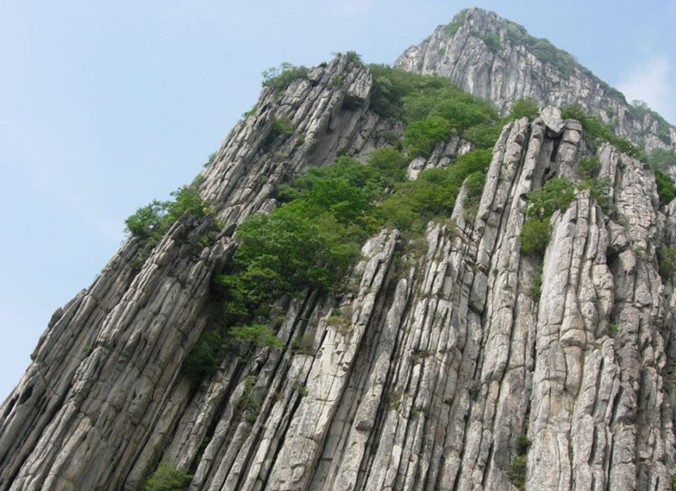 少室頂,其東北隅有石壁,版權所有山東聊城聊之旅國際旅行社有限公司,轉載必究!自山巔至底部一斧直削,高數百仞,俗稱“百丈崖”。崖間罅隙、石坎、孔穴頗多,是鳥類的安樂窩。每至晨夕,百鳥啁啾爭鳴,崖半翩翩飛舞,酷似一所“百鳥園”。循新修石階,攀至其巔,但見滿目玄巖怪石,樹木稀少,惟有矮小的側柏和荊棘灌叢,強生石縫間,點綴藍天懸峰。