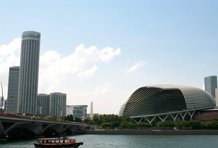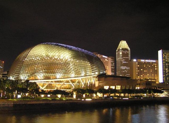 濱海藝術(shù)中心(The Esplanade),于2002年10月落成,是新加坡的地標建筑。外型奇特突出,宛若兩顆榴蓮,因此得名榴蓮藝術(shù)中心。但實質(zhì)上建筑師的靈感是采掘,根據(jù)蜻蜓的復(fù)眼來設(shè)計的。一開始可能感覺不到,當你看了濱海藝術(shù)中心的全景之后,可以越來越清晰地感到作者的想法及模仿蜻蜓復(fù)眼的逼真了。濱海藝術(shù)中心不僅外觀獨特,建筑物蘊含了不少的科學(xué)計算。它是由4,590片玻璃所組成的屋頂遮陽罩,依據(jù)新加坡日照環(huán)境的模擬計算設(shè)置。其內(nèi)部陳設(shè)卻充滿歐洲劇院風(fēng)味,功能多元化,包含音樂廳、戲劇院、購物中心、餐廳及戶外表演空間等,讓東方與西方的藝術(shù)文化在此撞擊出最美的火花。