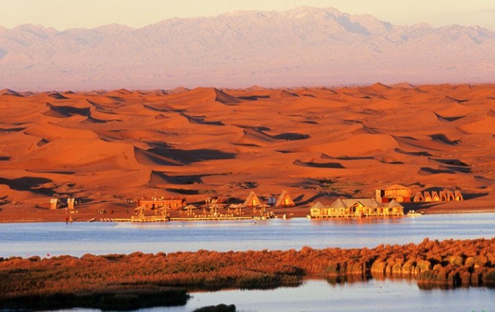 騰格里沙漠是中國第四大沙漠,也是現在流動速度最快、周邊人口密度最大的沙漠,是沙塵暴的主要發源地之一。月亮湖是騰格里腹地的純天然湖泊,也是一個完全處于原始狀態的沙漠綠洲。月亮湖有三奇:一奇是形狀酷似中國地圖。站在高處沙丘一看,一幅完整的中國地圖展現在眼前,蘆葦的分布更是將各省區一一標明。二奇是湖水天然藥浴配方。面積三平方公里的湖水富含鉀鹽、錳鹽、少量硭硝、天然蘇打、天然堿、氧化鐵及其它微量元素,與國際保健機構推薦藥浴配方極其相似。湖水極具生物凈化能力,能迅速改善,恢復自然原生態本色。三奇是千萬年黑沙灘。在長達一公里、寬近百米的天然浴場沙灘,推開其表層,下面是厚達十多米的純黑沙泥,其質地遠超死海的黑泥,更是天然泥療寶物.