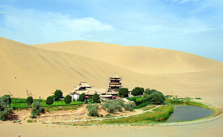 月牙泉位于敦煌市西南5公里處,是一處神奇的漫漫沙漠中的湖水奇觀。鳴沙山下,泉水形成一湖,在沙丘環(huán)抱之中,酷似一彎新月而得名月牙泉。月牙泉,古稱沙井,俗名藥泉,泉邊蘆葦叢生,水中魚兒自在,胡楊沙棗綠樹成蔭,羅布麻、枸杞等藥用植物豐茂,亭臺樓榭古香古色,春夏季節(jié)百花盛開,夏秋季節(jié)梨果飄香。自漢朝起即為“敦煌八景”之一,得名“月泉曉徹”。月牙泉南北長近100米,東西寬約25米,泉水東深西淺,最深處約5米,彎曲如新月,因而得名。一灣清泉,漣漪縈回,碧如翡翠。