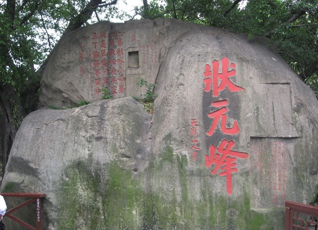 護國禪院之后的狀元峰,相傳因宋狀元陳誠之在此讀書而得名。附近有許多摩崖石刻,石刻被古榕樹根奇妙地包圍著,形成橢園型的大鏡面。附近有六鰲古跡:攬鰲亭、倚鰲軒、應鰲石、接鰲門、步鰲坡、聳鰲峰。位于福州市區東南五一廣場北側。戰國時期有于越族居此,故名。 相傳漢代有臨川何氏九兄弟在此山修仙煉丹,又名九仙山。最高處海 拔58.6米,是為鰲頂峰.后因宋代福州人陳誠在此讀書中了狀元,故又稱狀元峰。